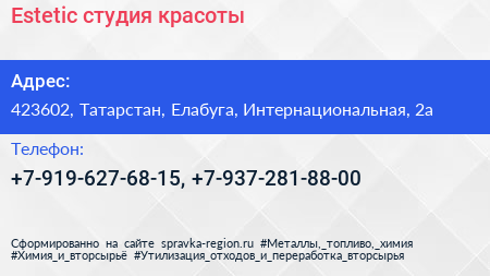 Estetic, студия красоты по адресу 423602, Татарстан, Елабуга, Интернациональная, 2а в дальнейшем Организация, размещена в следующих категориях: