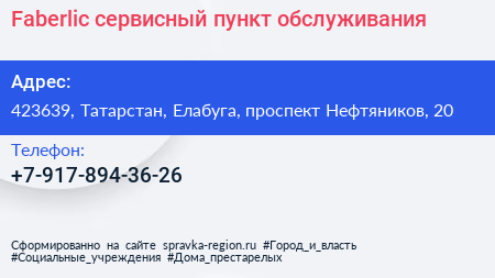 Faberlic, сервисный пункт обслуживания по адресу 423639, Татарстан, Елабуга, проспект Нефтяников, 20 в дальнейшем Организация, размещена в следующих категориях: