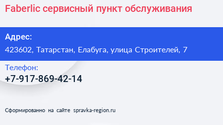 Faberlic, сервисный пункт обслуживания по адресу 423602, Татарстан, Елабуга, улица Строителей, 7 в дальнейшем Организация, размещена в следующих категориях: