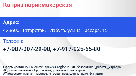 Каприз, парикмахерская по адресу 423600, Татарстан, Елабуга, улица Гассара, 15 в дальнейшем Организация, размещена в следующих категориях: