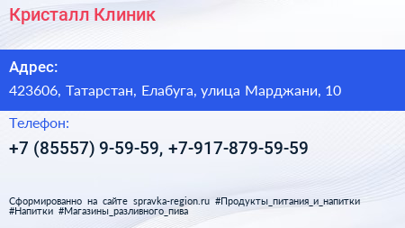 Кристалл Клиник по адресу 423606, Татарстан, Елабуга, улица Марджани, 10 в дальнейшем Организация, размещена в следующих категориях: