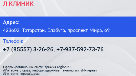 Л-КЛИНИК по адресу 423602, Татарстан, Елабуга, проспект Мира, 69 в дальнейшем Организация, размещена в следующих категориях: