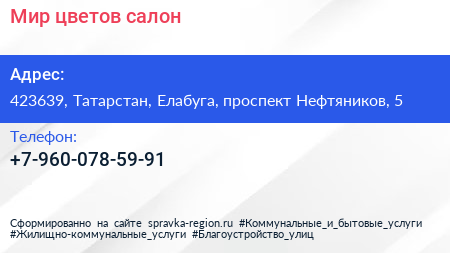 Мир цветов, салон по адресу 423639, Татарстан, Елабуга, проспект Нефтяников, 5 в дальнейшем Организация, размещена в следующих категориях: