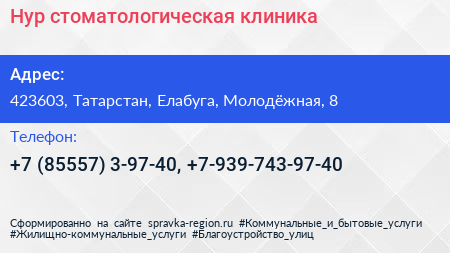 Нур, стоматологическая клиника по адресу 423603, Татарстан, Елабуга, Молодёжная, 8 в дальнейшем Организация, размещена в следующих категориях: