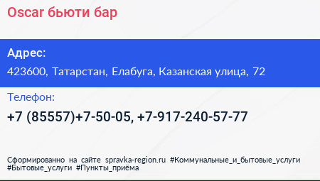 Оscar, бьюти-бар по адресу 423600, Татарстан, Елабуга, Казанская улица, 72 в дальнейшем Организация, размещена в следующих категориях: