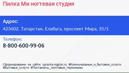 Пилка-Ми, ногтевая студия по адресу 423602, Татарстан, Елабуга, проспект Мира, 35/1 в дальнейшем Организация, размещена в следующих категориях:
