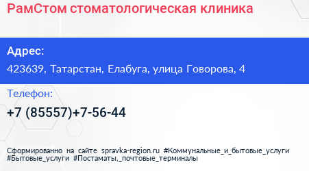 РамСтом, стоматологическая клиника по адресу 423639, Татарстан, Елабуга, улица Говорова, 4 в дальнейшем Организация, размещена в следующих категориях: