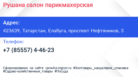 Рушана, салон-парикмахерская по адресу 423639, Татарстан, Елабуга, проспект Нефтяников, 3 в дальнейшем Организация, размещена в следующих категориях: