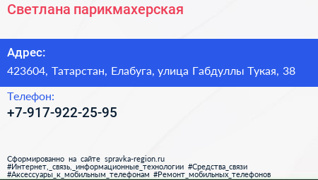 Светлана, парикмахерская по адресу 423604, Татарстан, Елабуга, улица Габдуллы Тукая, 38 в дальнейшем Организация, размещена в следующих категориях: