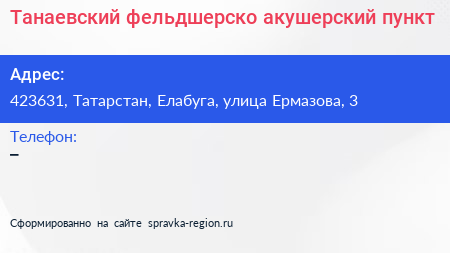 Танаевский фельдшерско-акушерский пункт по адресу 423631, Татарстан, Елабуга, улица Ермазова, 3 в дальнейшем Организация, размещена в следующих категориях:
