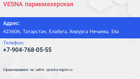VESNA, парикмахерская по адресу 423606, Татарстан, Елабуга, Хирурга Нечаева, 16а в дальнейшем Организация, размещена в следующих категориях: