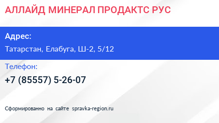 АЛЛАЙД МИНЕРАЛ ПРОДАКТС РУС по адресу Татарстан, Елабуга, Ш-2, 5/12 в дальнейшем Организация, размещена в следующих категориях:
