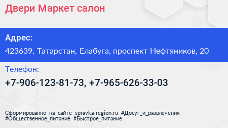 Двери Маркет, салон по адресу 423639, Татарстан, Елабуга, проспект Нефтяников, 20 в дальнейшем Организация, размещена в следующих категориях: