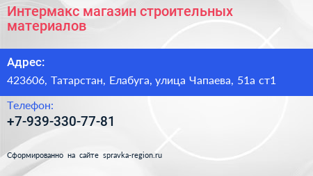 Интермакс, магазин строительных материалов по адресу 423606, Татарстан, Елабуга, улица Чапаева, 51а ст1 в дальнейшем Организация, размещена в следующих категориях: