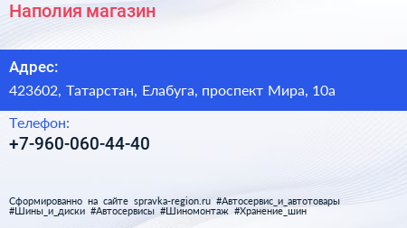 Наполия, магазин по адресу 423602, Татарстан, Елабуга, проспект Мира, 10а в дальнейшем Организация, размещена в следующих категориях: