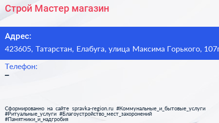 Строй Мастер, магазин по адресу 423605, Татарстан, Елабуга, улица Максима Горького, 107г в дальнейшем Организация, размещена в следующих категориях:
