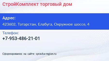 СтройКомплект, торговый дом по адресу 423602, Татарстан, Елабуга, Окружное шоссе, 4 в дальнейшем Организация, размещена в следующих категориях:
