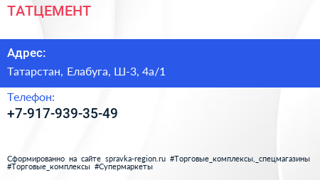 ТАТЦЕМЕНТ по адресу Татарстан, Елабуга, Ш-3, 4а/1 в дальнейшем Организация, размещена в следующих категориях: