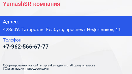 YamashSR, компания по адресу 423639, Татарстан, Елабуга, проспект Нефтяников, 11 в дальнейшем Организация, размещена в следующих категориях:
