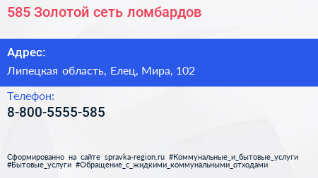 585*Золотой, сеть ломбардов по адресу Липецкая область, Елец, Мира, 102 в дальнейшем Организация, размещена в следующих категориях:
