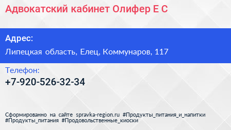 Адвокатский кабинет Олифер Е.С. по адресу Липецкая область, Елец, Коммунаров, 117 в дальнейшем Организация, размещена в следующих категориях: