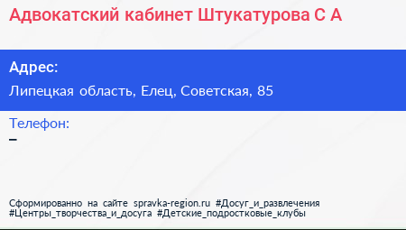 Адвокатский кабинет Штукатурова С.А. по адресу Липецкая область, Елец, Советская, 85 в дальнейшем Организация, размещена в следующих категориях:
