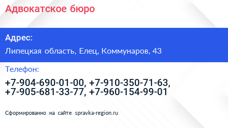 Адвокатское бюро по адресу Липецкая область, Елец, Коммунаров, 43 в дальнейшем Организация, размещена в следующих категориях: