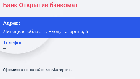 Банк Открытие, банкомат по адресу Липецкая область, Елец, Гагарина, 5 в дальнейшем Организация, размещена в следующих категориях: