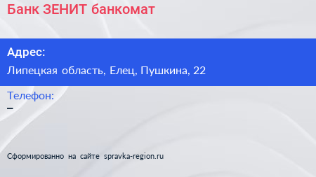 Банк ЗЕНИТ, банкомат по адресу Липецкая область, Елец, Пушкина, 22 в дальнейшем Организация, размещена в следующих категориях: