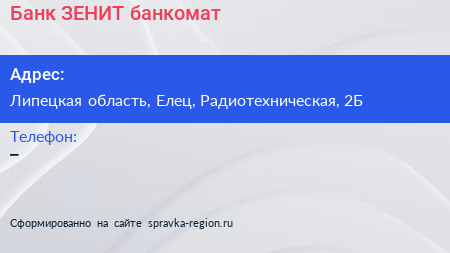 Банк ЗЕНИТ, банкомат по адресу Липецкая область, Елец, Радиотехническая, 2Б в дальнейшем Организация, размещена в следующих категориях: