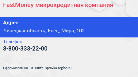 FastMoney, микрокредитная компания по адресу Липецкая область, Елец, Мира, 102 в дальнейшем Организация, размещена в следующих категориях: