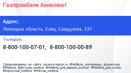 Газпромбанк, банкомат по адресу Липецкая область, Елец, Свердлова, 137 в дальнейшем Организация, размещена в следующих категориях:
