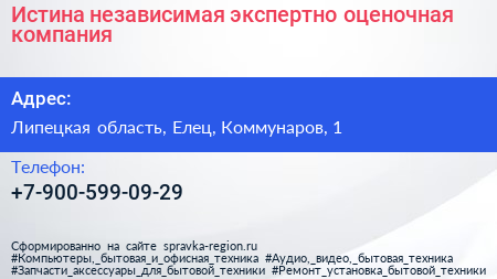 Истина, независимая экспертно-оценочная компания по адресу Липецкая область, Елец, Коммунаров, 1 в дальнейшем Организация, размещена в следующих категориях: