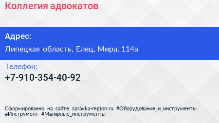 Коллегия адвокатов по адресу Липецкая область, Елец, Мира, 114а в дальнейшем Организация, размещена в следующих категориях: