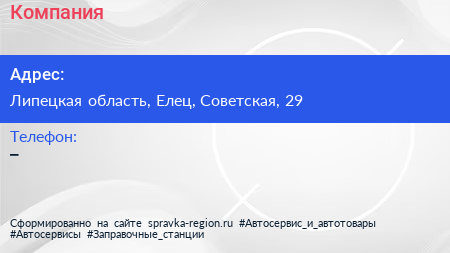 Компания по адресу Липецкая область, Елец, Советская, 29 в дальнейшем Организация, размещена в следующих категориях:
