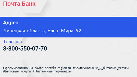 Почта Банк по адресу Липецкая область, Елец, Мира, 92 в дальнейшем Организация, размещена в следующих категориях: