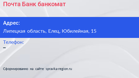 Почта Банк, банкомат по адресу Липецкая область, Елец, Юбилейная, 15 в дальнейшем Организация, размещена в следующих категориях:
