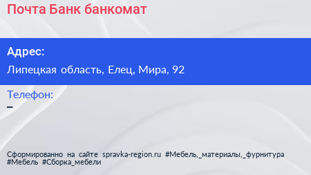 Почта Банк, банкомат по адресу Липецкая область, Елец, Мира, 92 в дальнейшем Организация, размещена в следующих категориях: