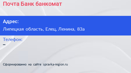 Почта Банк, банкомат по адресу Липецкая область, Елец, Ленина, 83а в дальнейшем Организация, размещена в следующих категориях: