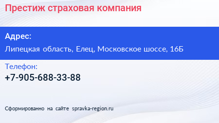 Престиж, страховая компания по адресу Липецкая область, Елец, Московское шоссе, 16Б в дальнейшем Организация, размещена в следующих категориях:
