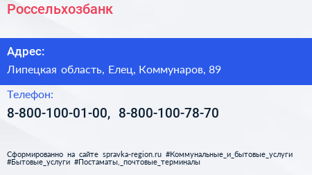Россельхозбанк по адресу Липецкая область, Елец, Коммунаров, 89 в дальнейшем Организация, размещена в следующих категориях: