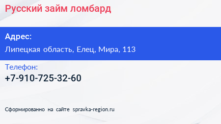 Русский займ, ломбард по адресу Липецкая область, Елец, Мира, 113 в дальнейшем Организация, размещена в следующих категориях: