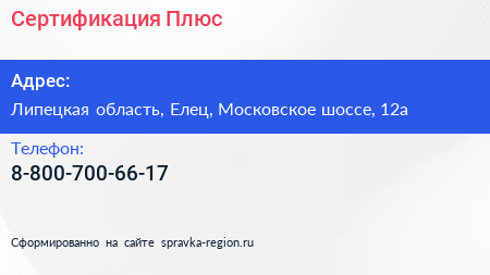 Сертификация Плюс по адресу Липецкая область, Елец, Московское шоссе, 12а в дальнейшем Организация, размещена в следующих категориях: