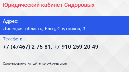 Юридический кабинет Сидоровых по адресу Липецкая область, Елец, Спутников, 3 в дальнейшем Организация, размещена в следующих категориях: