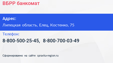 ВБРР, банкомат по адресу Липецкая область, Елец, Костенко, 75 в дальнейшем Организация, размещена в следующих категориях: