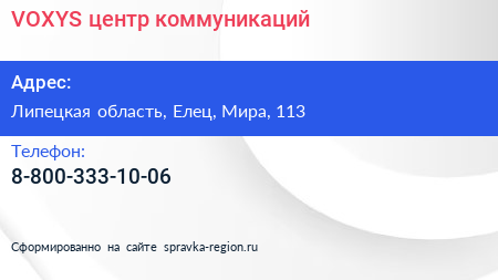VOXYS, центр коммуникаций по адресу Липецкая область, Елец, Мира, 113 в дальнейшем Организация, размещена в следующих категориях: