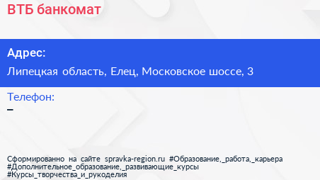 ВТБ, банкомат по адресу Липецкая область, Елец, Московское шоссе, 3 в дальнейшем Организация, размещена в следующих категориях: