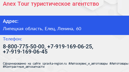 Anex Tour, туристическое агентство по адресу Липецкая область, Елец, Ленина, 60 в дальнейшем Организация, размещена в следующих категориях: