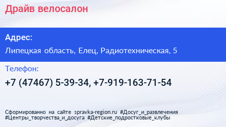 Драйв, велосалон по адресу Липецкая область, Елец, Радиотехническая, 5 в дальнейшем Организация, размещена в следующих категориях: