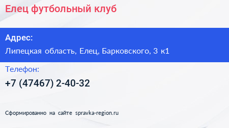 Елец, футбольный клуб по адресу Липецкая область, Елец, Барковского, 3 к1 в дальнейшем Организация, размещена в следующих категориях: